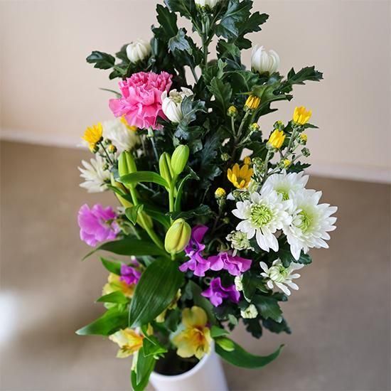 白を基調に、紫・黄など落ち着いた色味でまとめたスタンド型のお花は、法要・供養・お盆・お彼岸などに広くご利用いただいています。